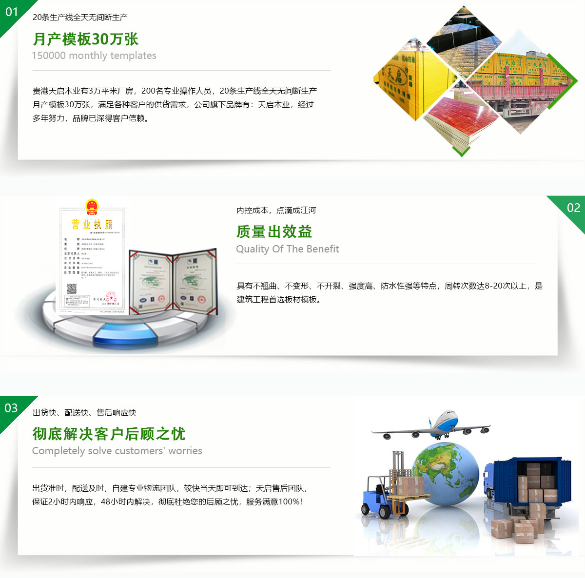貴港市天啟木業(yè)位廣西貴港市覃塘區(qū),是中國建筑模行業(yè)規(guī)模十大的企業(yè)之一,有著優(yōu)越地理位置,臨廣東,貴州,湖南,云南、交通運輸區(qū)位十分優(yōu)勢。現(xiàn)有職工近300人,占地50余畝,其中建筑面積近3萬平方米。日產(chǎn)量2萬張,年產(chǎn)量500萬余張;公司正在逐步壯大,旗下有4家分公司,總年產(chǎn)量近1500萬張!天啟木業(yè)引進(jìn)芬蘭制膠技術(shù),采用先進(jìn)生產(chǎn)工藝。公司生產(chǎn)的建筑膜板采用優(yōu)質(zhì)的防水膠制作,循環(huán)使用次數(shù)多,品質(zhì)在同行業(yè)內(nèi)認(rèn)可度極高。是一家集產(chǎn)品研發(fā),生產(chǎn),銷售,服務(wù)于一體的綜合型大型民營企業(yè)。產(chǎn)品覆蓋全國20多個省,市,自治區(qū)。
